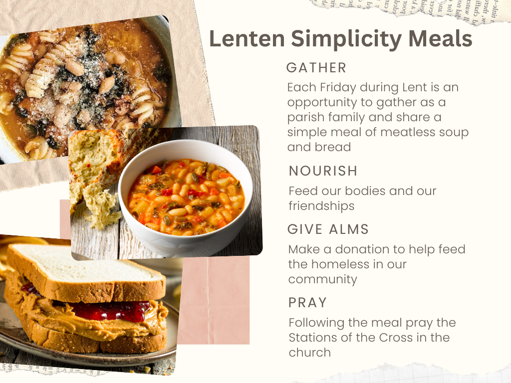 Lenten Simplicity Meals: Each Friday in Lent, at 6:00pm, we gather as a parish family to share a simple meal of meatless soup and bread. We also provide peanut butter & jelly for the children. A different parish organization or ministry hosts each week.