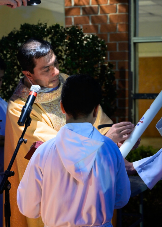The Mass of the Resurrection of the Lord begins outside at the fire pit, with the lighting of the Easter Fire and blessing of the Paschal Candle. We welcome into the Church the Elect with Baptism, Confirmation and Eucharist.