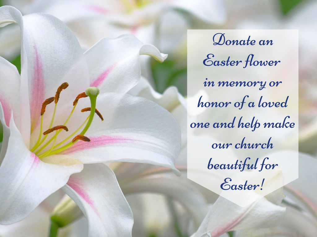Help make our Church beautiful for the Easter season! Donate towards the purchase of flowers that will be used to decorate the Sanctuary for the season of Easter. Flowers can be in honor or memory of a loved one, or monies may just be donated. Use the flower envelopes in your envelope packet, donate on our Weshare online giving site (Weshare Giving), or use a plain white envelope marking on the outside 'Easter Flowers.' Click HERE to see a listing of Memorials/Honorings. The suggested donation is $20.00 per flower.