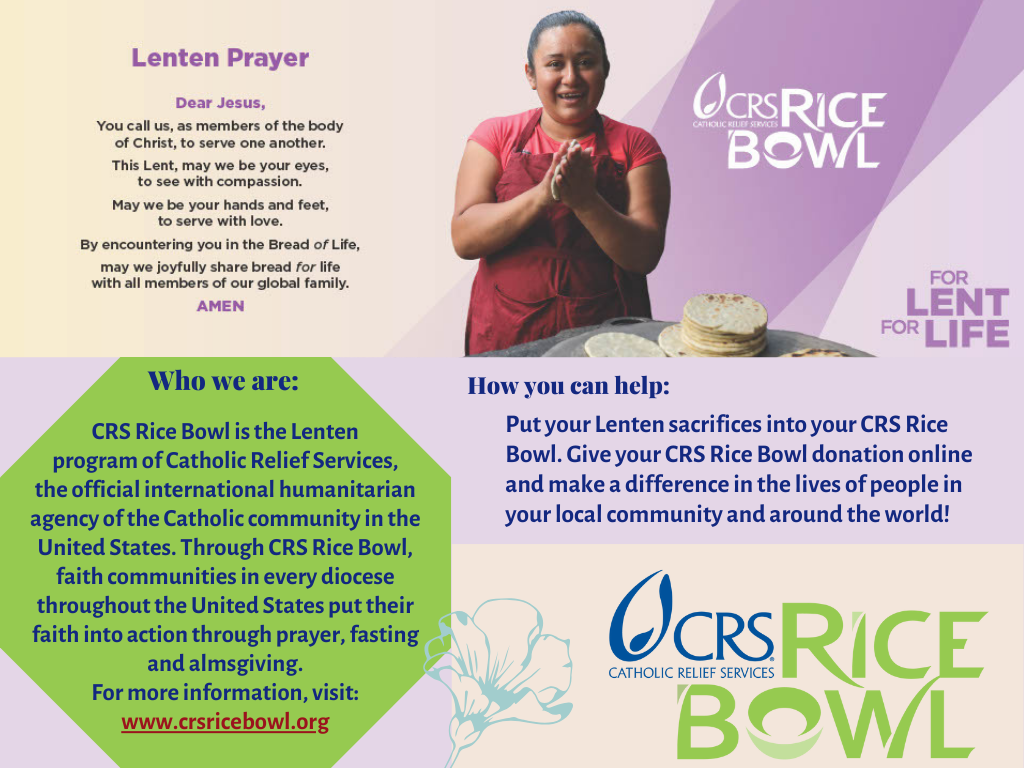 Lenten Rice Bowls are available in the gathering space. If you did not take one, you can make a donation online at https://seaschurch.weshareonline.org/ CRS Rice Bowl is the Lenten program of Catholic Relief Services, the official relief and development agency of the United Stated Conference of Catholic Bishops (USCCB). Through CRS Rice Bowl, faith communities in every diocese throughout the U.S. put their faith into action through prayer, fasting and almsgiving. Lenten alms donated through CRS Rice Bowl support the work of CRS in roughly 45 different countries each year. 25% of all donations to CRS Rice Boel stay in ur local diocese, supporting hunger and poverty alleviation. More info at: https:www.crsricebowl.org